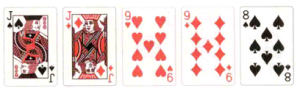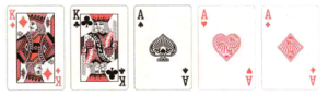 滿堂紅:三張相同點數的牌,外加兩張另一點數的牌(也稱為「葫蘆」)。
