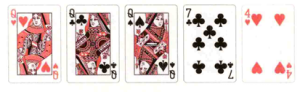 三條:三張相同點數的牌,外加兩張不相關的牌。